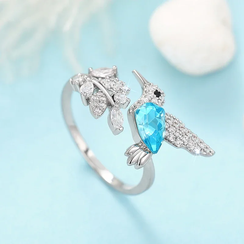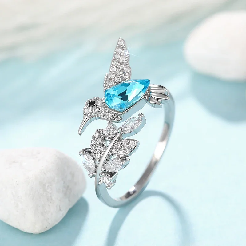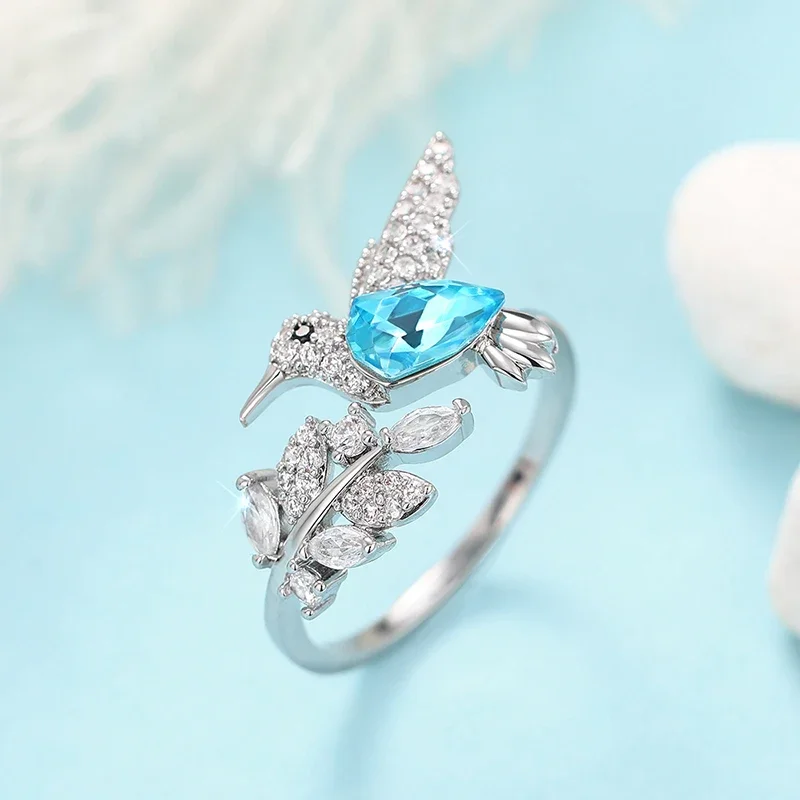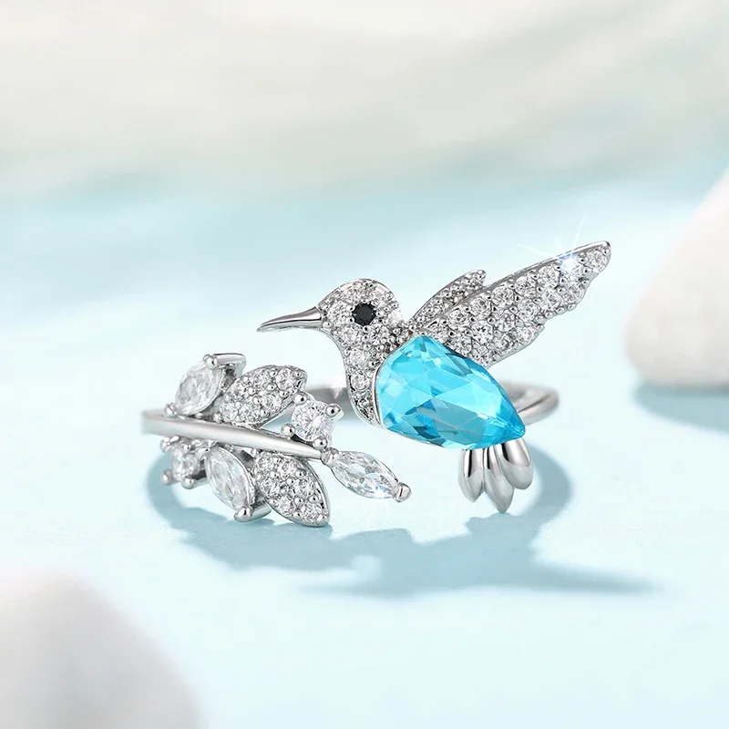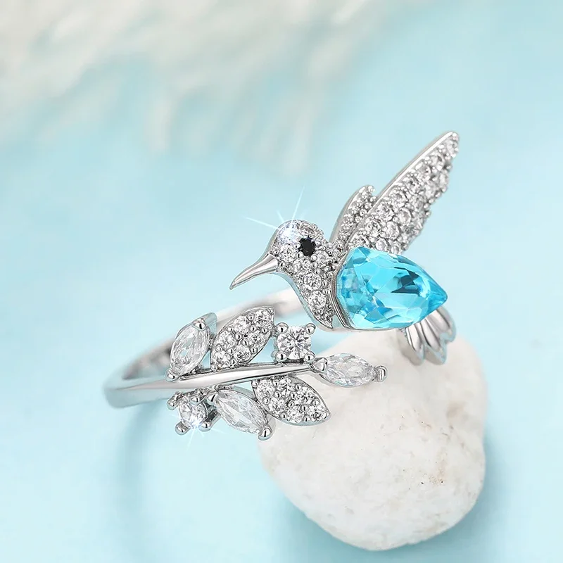 Huitan Full Shiny CZ Women Opening Ring Cute Blue Bird Design Fresh Leaf Shaped Elegant Party Daily Accessories Charming Jewelry