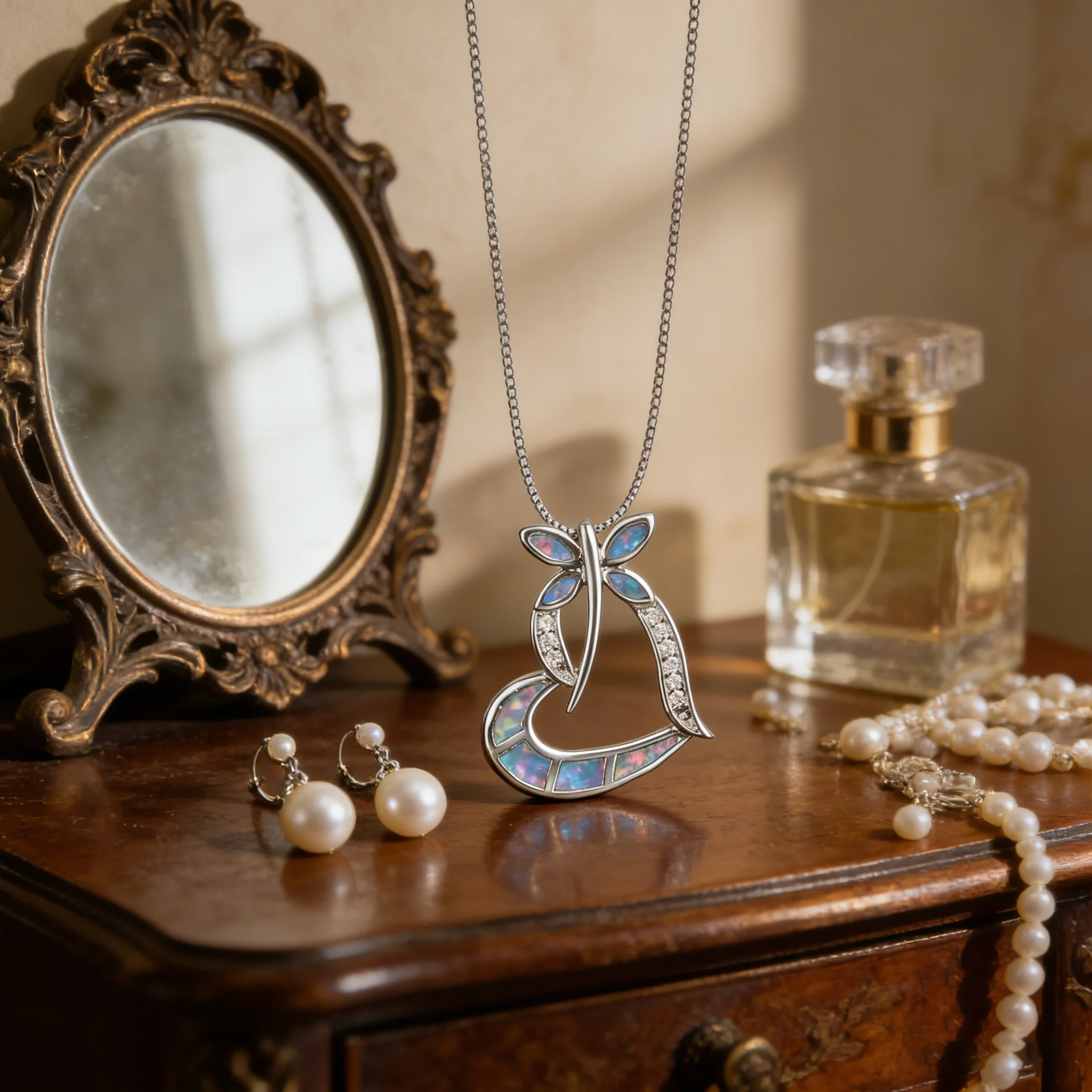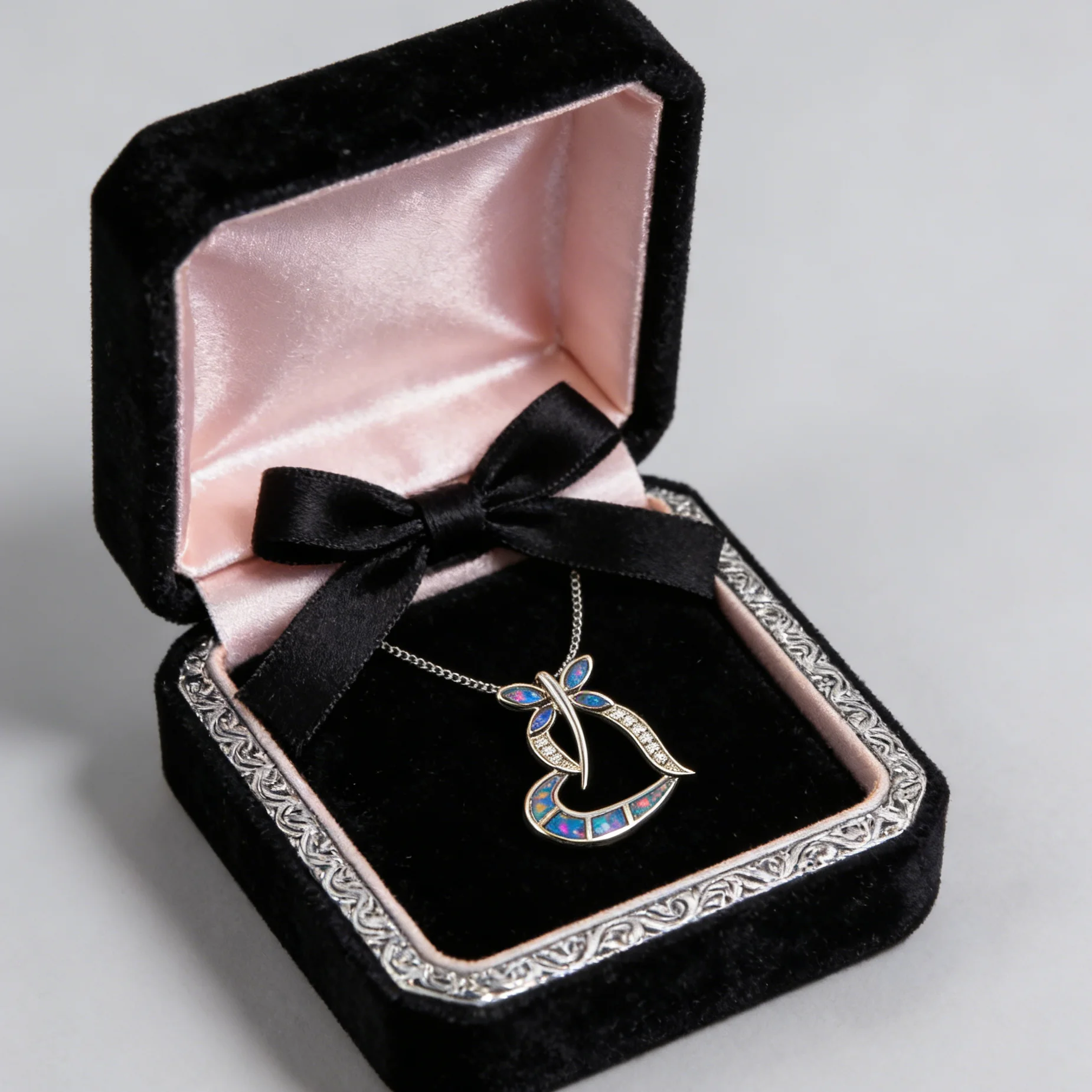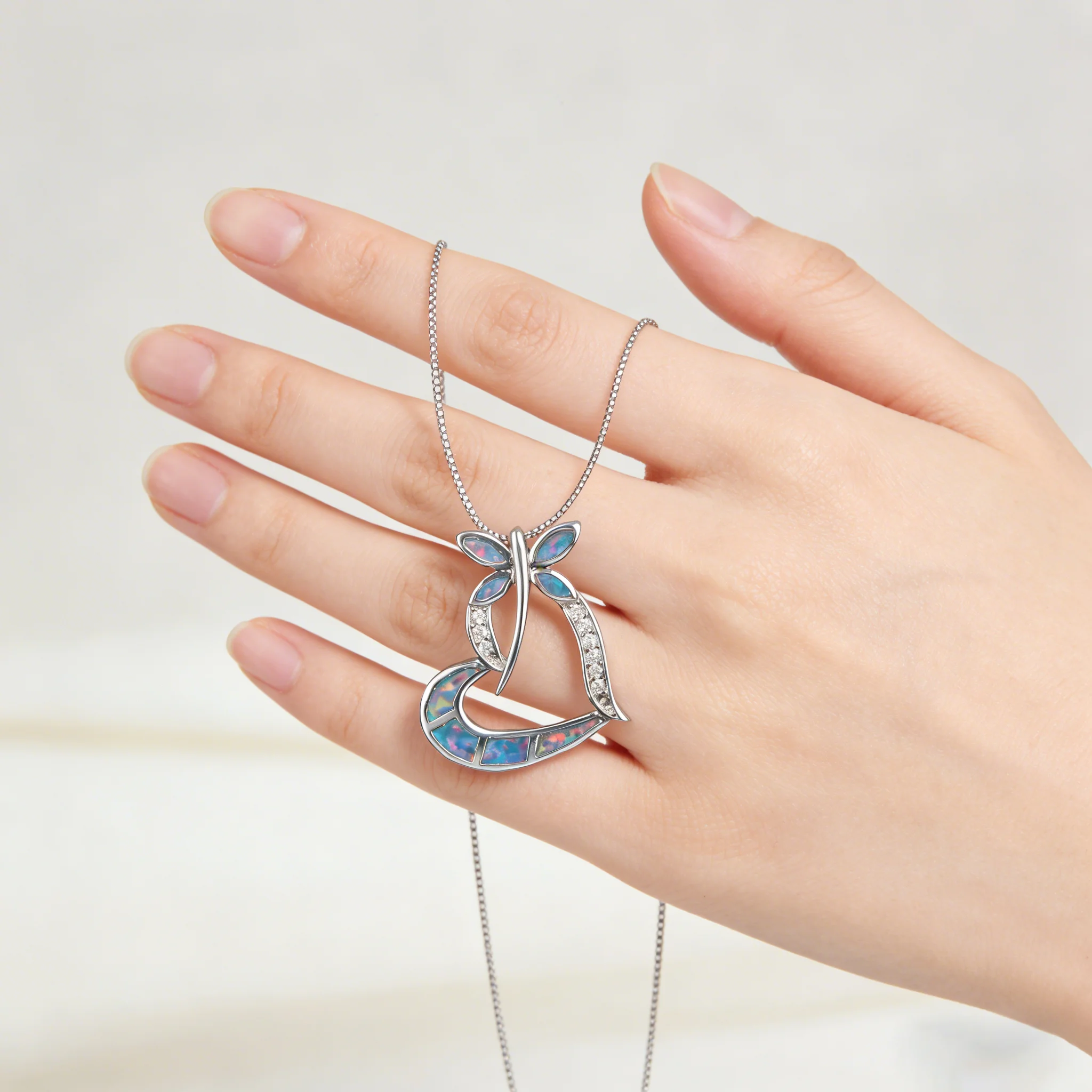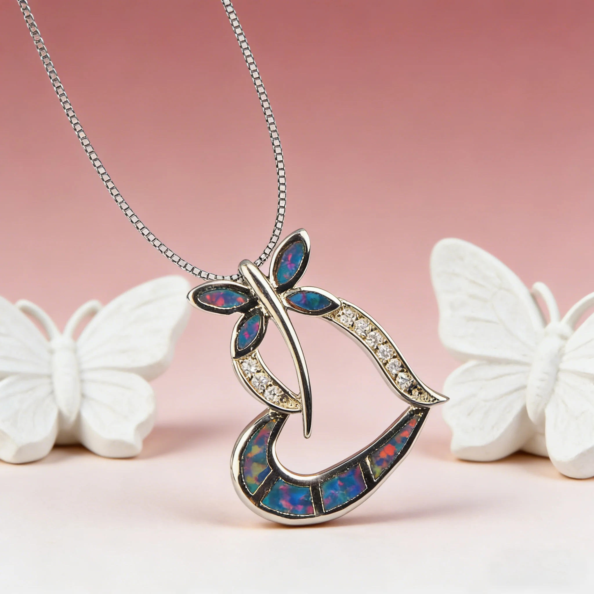 Crafted with a heart-shaped opal, this pendant offers an iridescent glow that catches the eye and captivates the heart.
